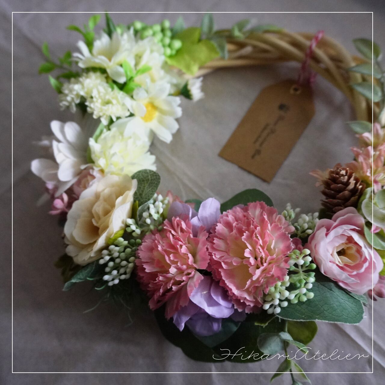こちらは、『ピンクカーネーションと小花たちのリース:アーティシャルフラワーアレンジリース』です。