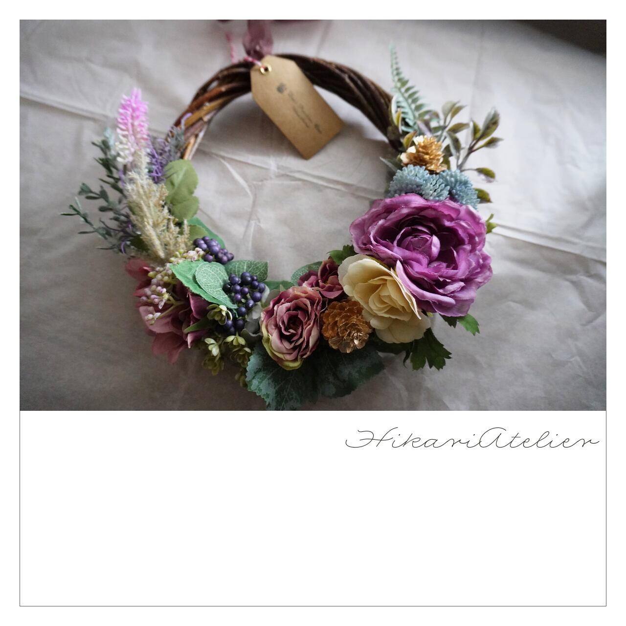 こちらは、『紫色のラナンキュラスと小さなバラたちのリース:アーティシャルフラワーアレンジリース』です。