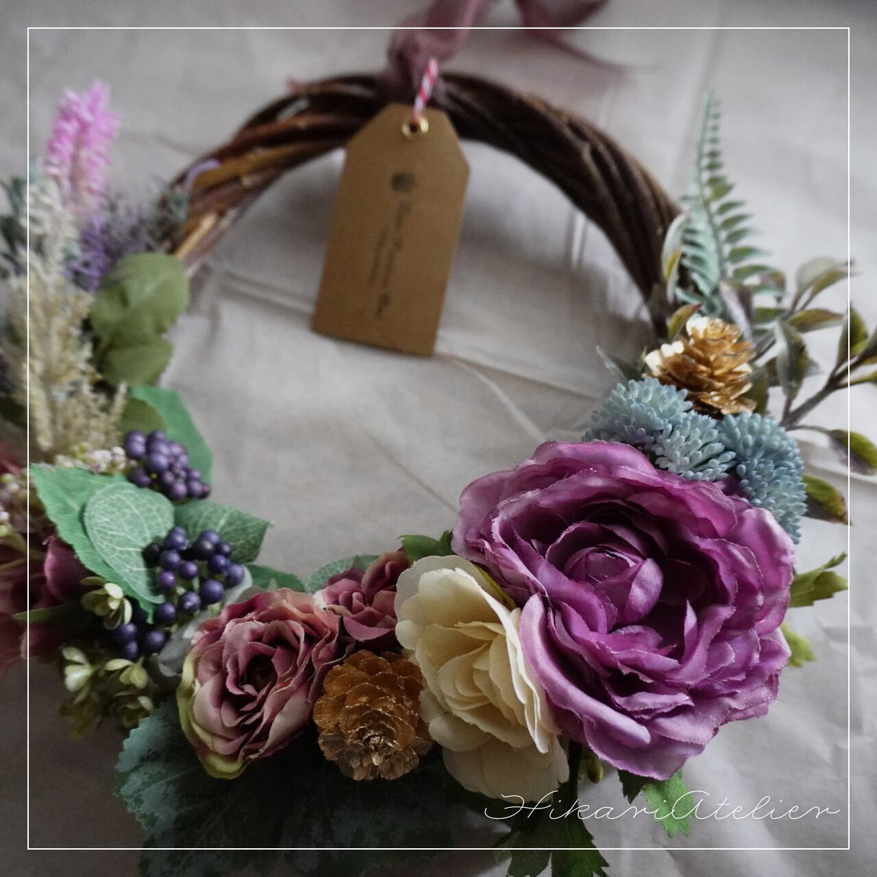 このリースは最初に紫色のラナンキュラスが引き立つようなリースがいいな…というところから、寄せ集められた小さなバラはシックな紫色やクリーム色で、金色の松ぼっくりも引き立て役となってくれています。