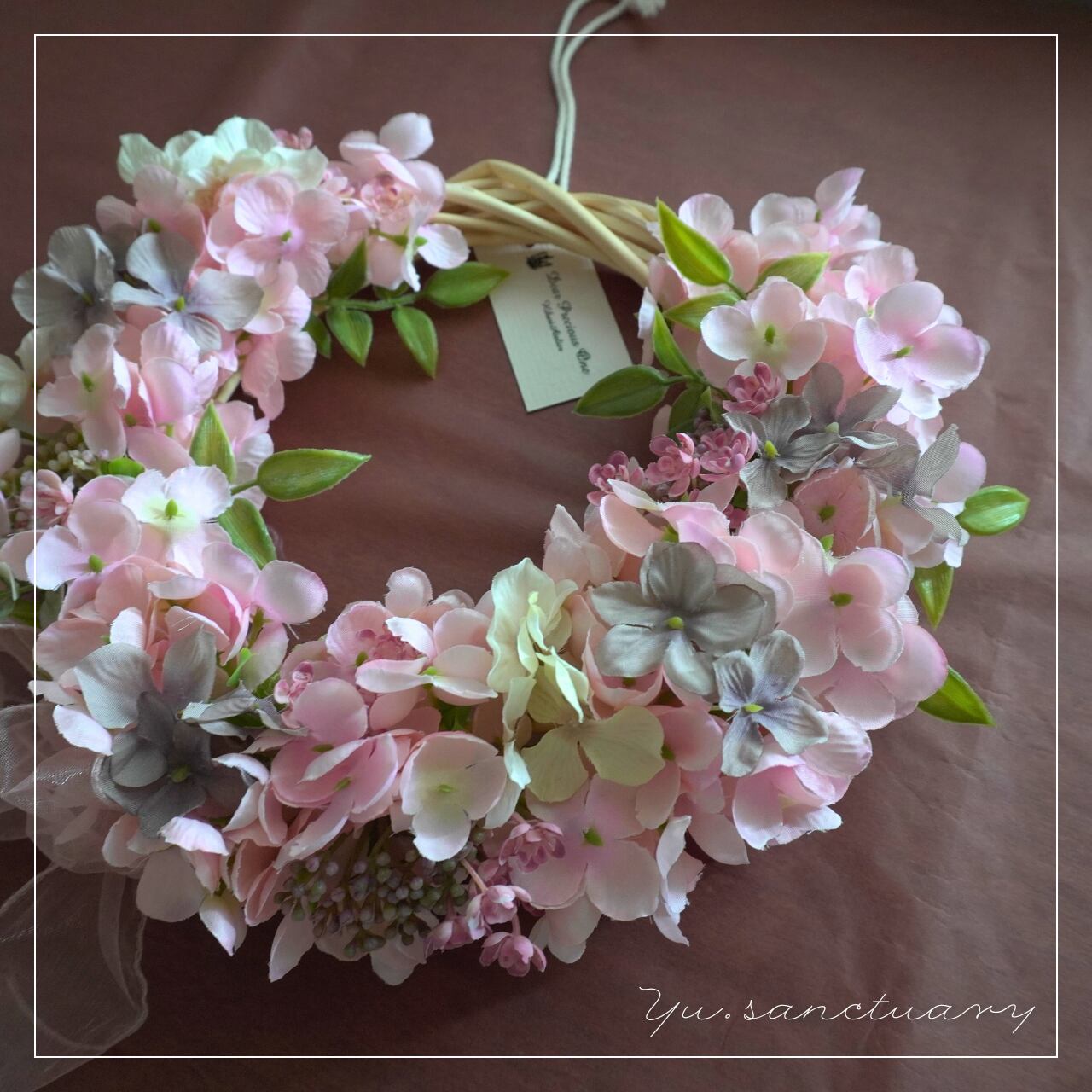 こちらは、『やわらぎの薄ピンクの花びらリース:アーティシャルフラワーアレンジリース』です。