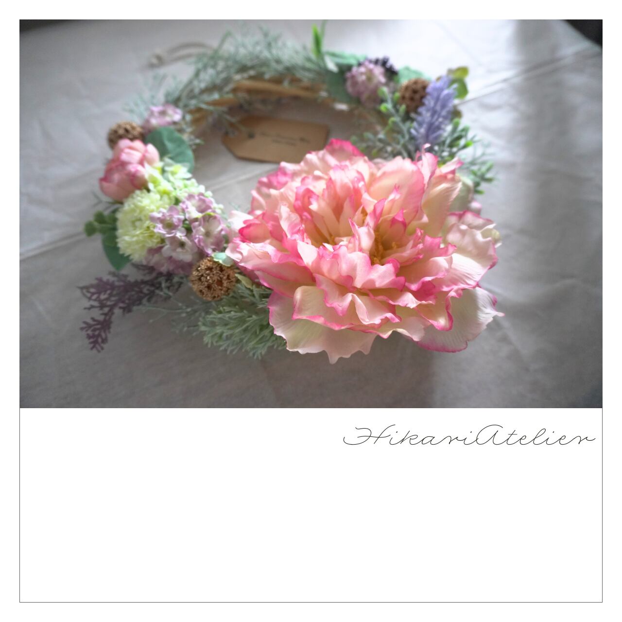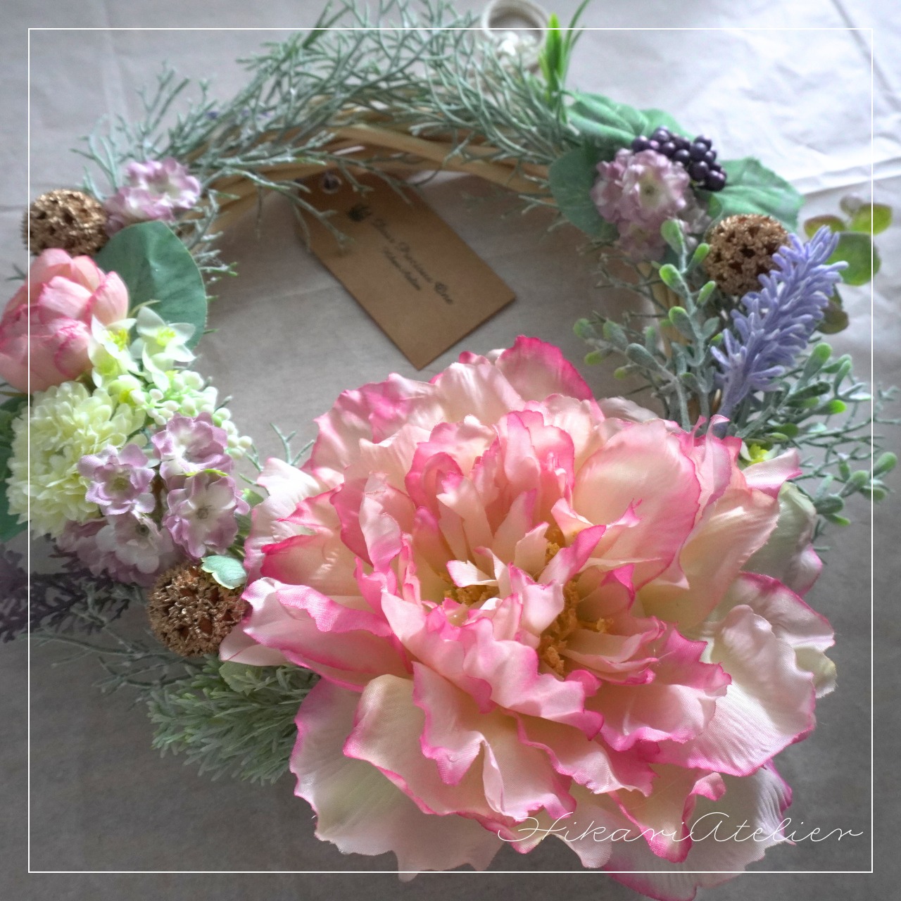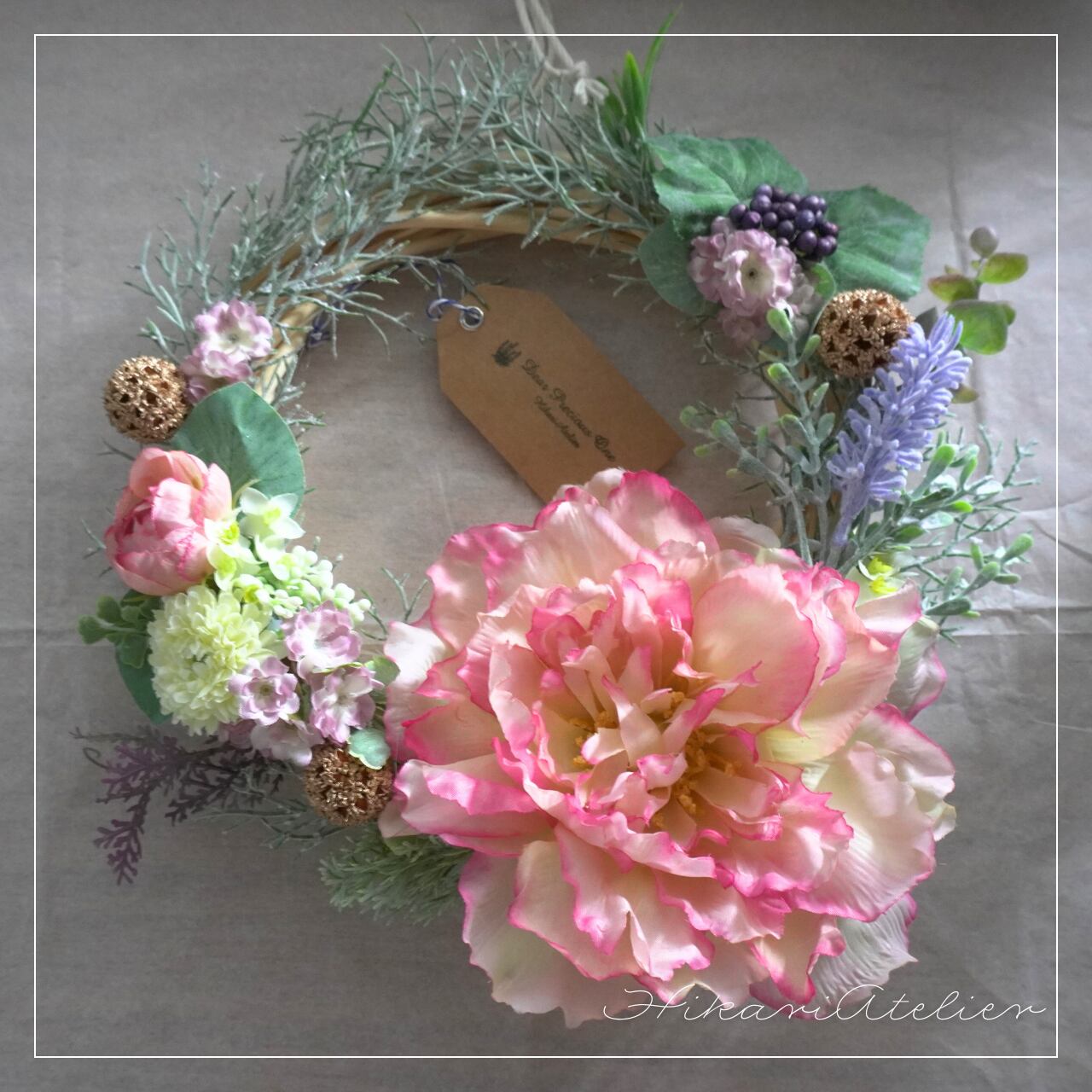 こちらは、『ピンクの芍薬とラベンダーと小花たちのリース:アーティシャルフラワーアレンジリース』です。